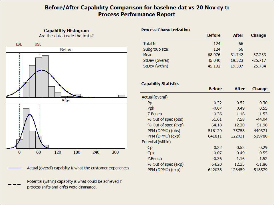 Durch Vergleiche mit der Minitab-Prozessfähigkeitsanalyse konnten Wentz und das Lean Six Sigma-Team der U.S. Army erkennen, ob die Projektziele durch ihre Lösungen für die Prozessverbesserung erreicht wurden.
