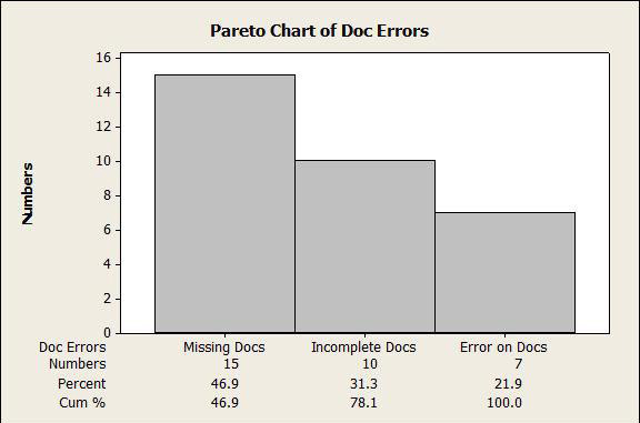 Wentz erstellte in Minitab ein Pareto-Diagramm der Dokumentationsfehler für den MMRB-Prozess, wodurch das Team kritische Dokumentationsfehler schnell identifizieren und priorisieren konnte. Die Teammitglieder konnten fehlende Dokumentation als Hauptproblem erkennen und dann Verbesserungen vornehmen, um speziell diese Schwachstelle im Prozess zu beheben.