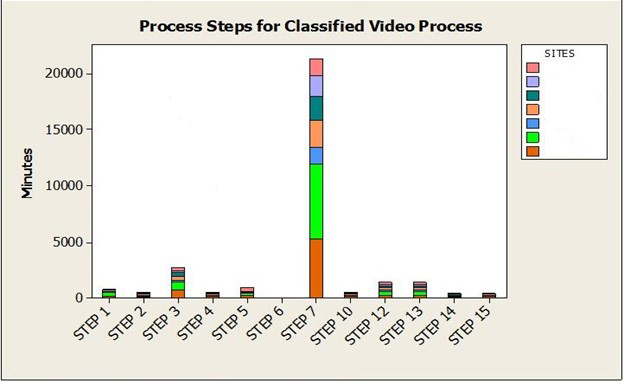 Mit Minitab-Balkendiagrammen analysierte das Team, wie viel Zeit die Techniker auf die einzelnen Schritte des Überwachungsprozesses an den einzelnen Einsatzorten verwendeten. Dabei konnten leicht die Prozessschritte gezeigt werden, an denen große Engpässe auftraten.