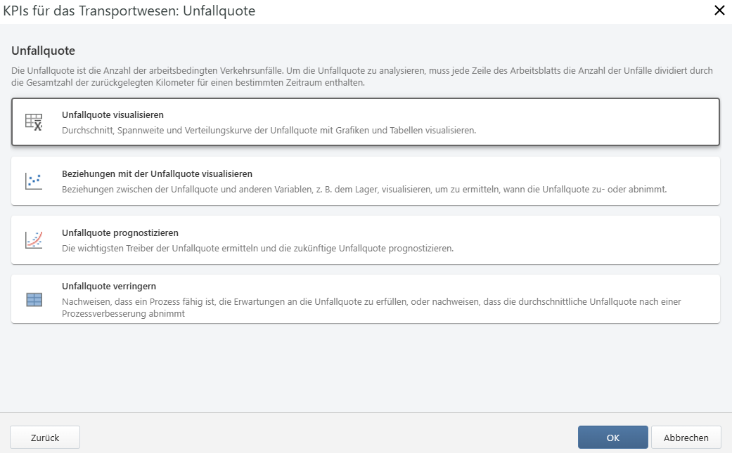 Mit dem Modul können sich Fachkräfte im Transportwesen auf die Verbesserung der wichtigsten Leistungskennzahlen (KPIs) wie betriebliche Effizienz, Anlagenauslastung, Transitzeit, Sicherheit, Umweltauswirkungen, finanzielle Leistung und Kundendienst konzentrieren – ohne sich noch zusätzlich Statistikkenntnisse anzueignen, um die richtige Analysemethode auszuwählen.