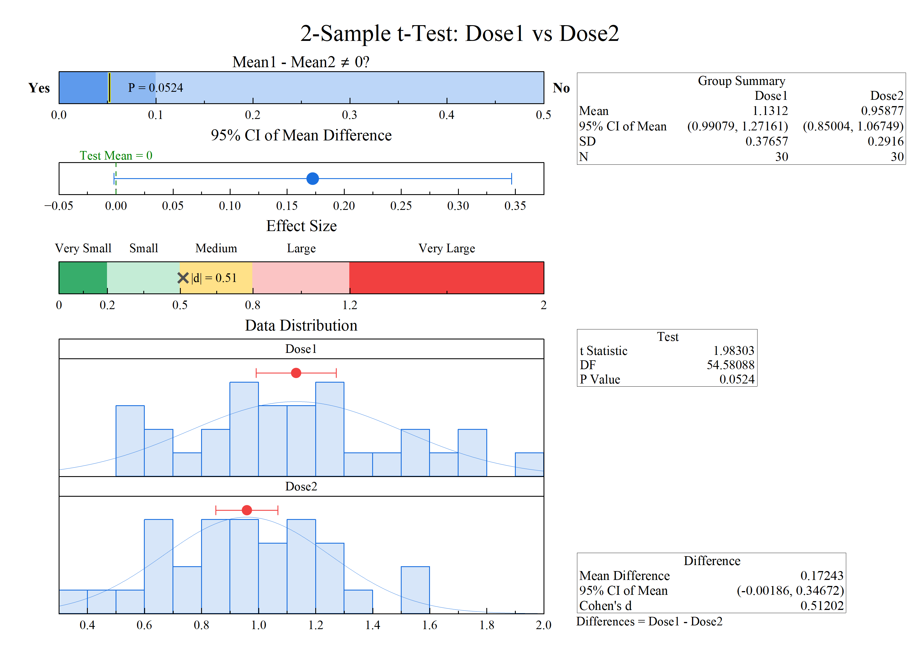 OriginPro 2026: Abschlussdiagramm von t-Test bei 2 Stichproben