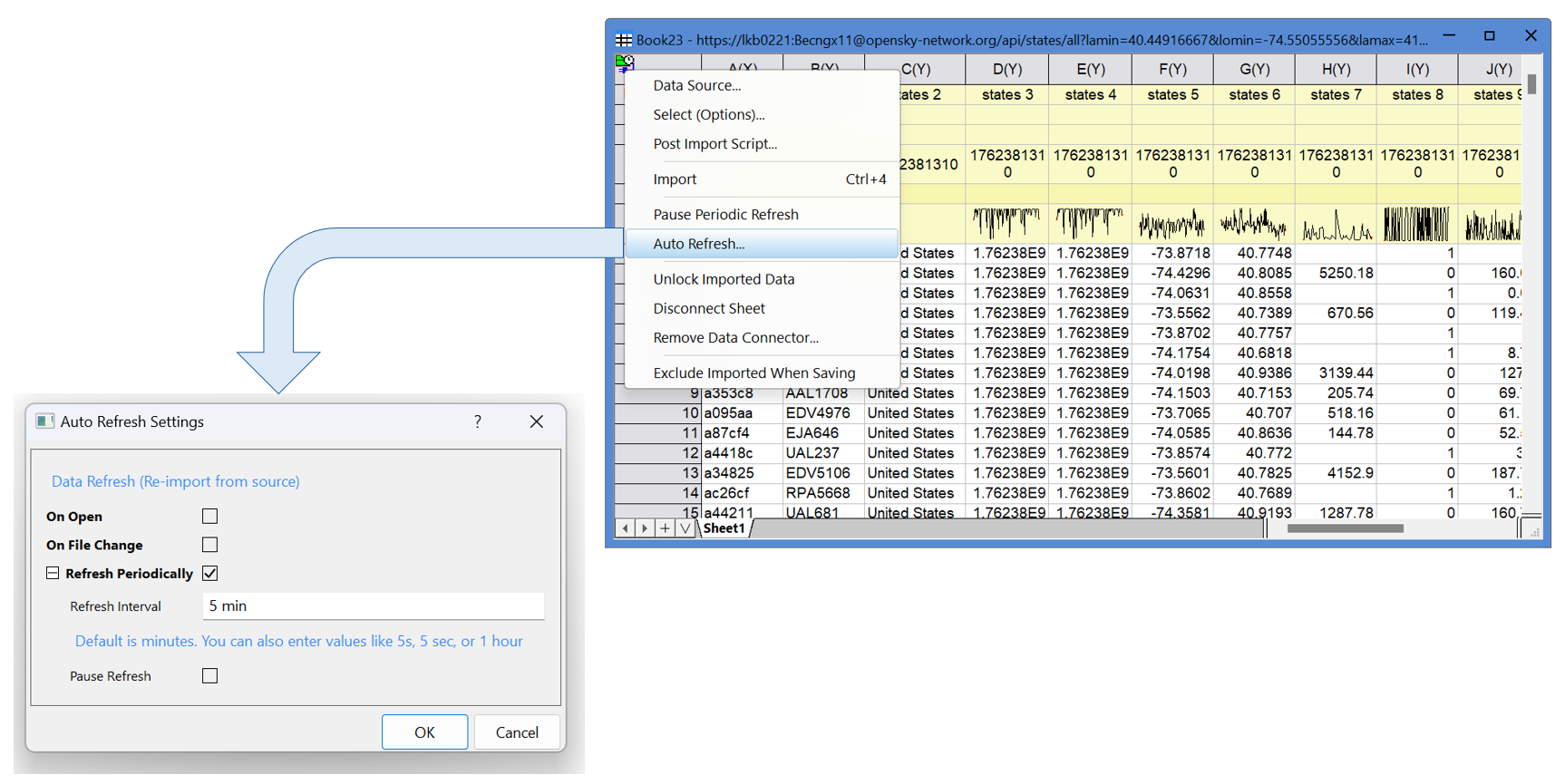 Der Datenkonnektor kann in OriginPro und Origin 2026so eingerichtet werden, dass Daten aus der Datenquelle regelmäßig neu importiert werden. Dies ist nützlich in Situationen, in denen sich Daten ändern oder mehr Daten zur Quelle hinzugefügt werden und Sie möchten, dass diese in regelmäßigen Abständen in Origin aktualisiert werden.