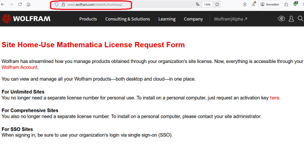 Für die Anfrage von Site „Home Use" Lizenzen wurde bisher die allgemeine Webseite https://www.wolfram.com/siteinfo/homeuse verwendet. Die Funktion dieses Formulars ist nach der Umstellung der Site Lizenzen von user.wolfram.com auf account.wolfram.com nicht mehr verfügbar. Stattdessen erhalten die Nutzer folgenden Hinweis: