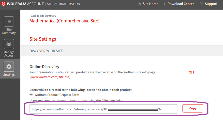 Der Administrator kann aus dem neuen Portal unter dem Punkt "Site Settings" eine individuelle Web-Formular URL an die anfragenden Anwender senden (oder diese auf einer internen Webseite veröffentlichen). Die URL beginnt immer mit https://account.wolfram.com/site-request-access/ und wird durch die individuelle ID ergänzt. Hier ein Beispiel, wie man diese findet:
