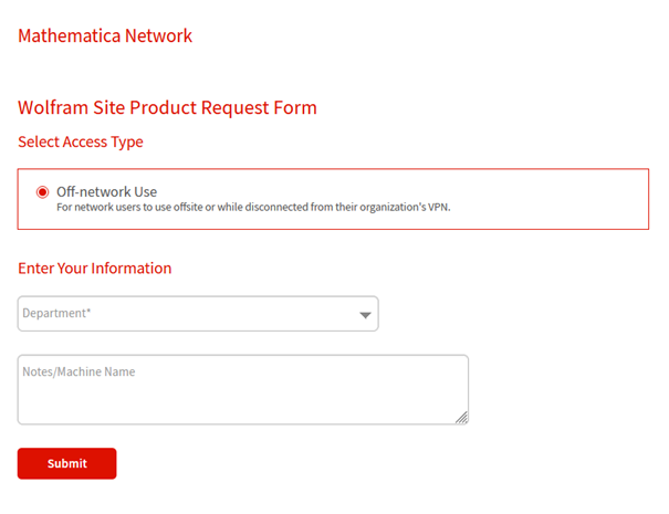 Nutzer können mit diesem Formular Aktivierungsschlüssel beim Administrator anfragen. Anwender, die vor der Umstellung eine Home-Use Lizenz nutzen konnten, weil Sie am Institut eine Netzwerklizenz genutzt haben, wählen hier "Off-network Use":