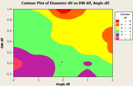 Mit dem Konturdiagramm in Minitab konnten Quirós und sein Team bequem den Zusammenhang zwischen den Variablen für Laufflächen aus Streifen und dem Durchmesser der fertigen Reifen untersuchen.