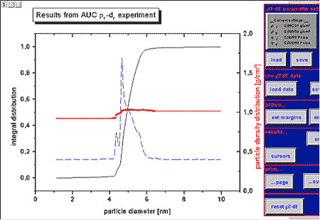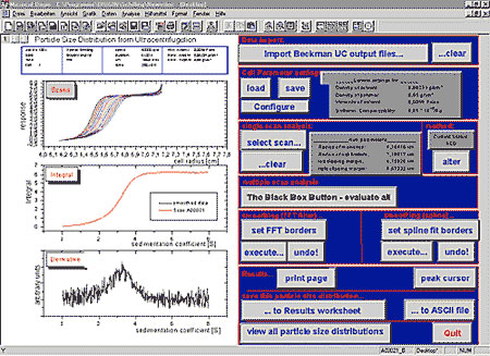 Nach dem Einlesen der Rohdaten wird die Verteilung des Sedimentationskoeffizienten berechnet. Danach erfolgt die Glättung der Werte mit Hilfe des eingebauten FFT-Filters in Origin oder mit einer Splinefunktion, die mittels einer externen DLL eingebunden werden kann, bearbeitet.