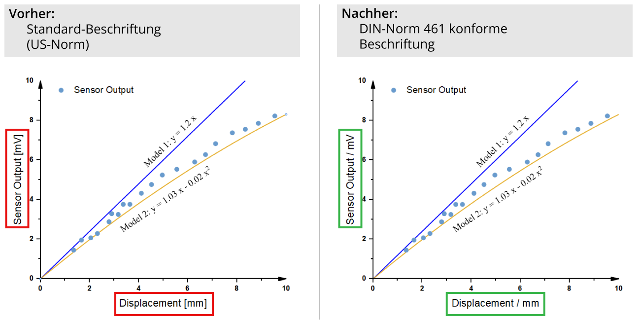 Die Achsenbeschriftung für Einheiten nach DIN 461 verlangt die Trennung von physikalischer Größe und Einheit durch einen Schrägstrich (z. B. Zeit / s). In Origin lässt sich dies über Platzhalter wie %(?X,@LL) / %(?X,@LU) oder automatisiert per ADDITIVE-Designvorlage umsetzen.