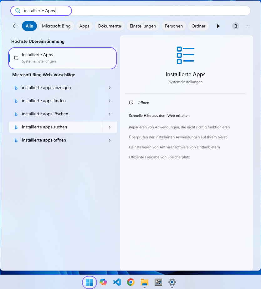 Öffnen Sie über das Windows-Startmenü den Bildschirm "Installierte Apps".