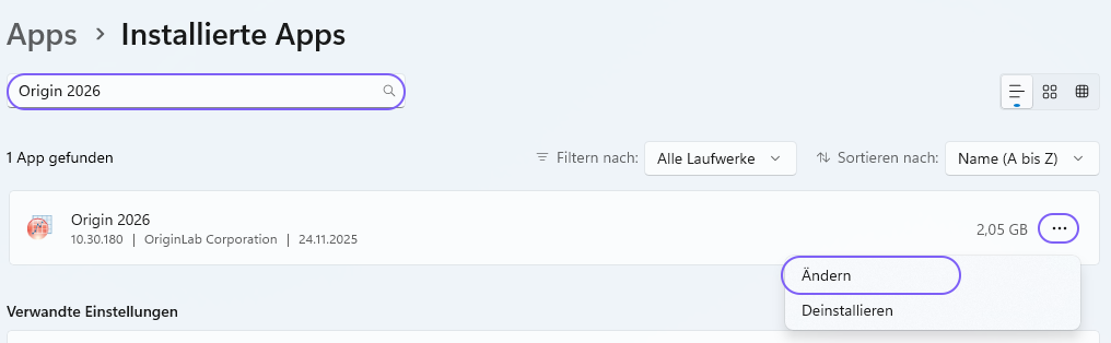 Suchen Sie hier nach Ihrer Origin Version und wählen Sie "Ändern" aus.