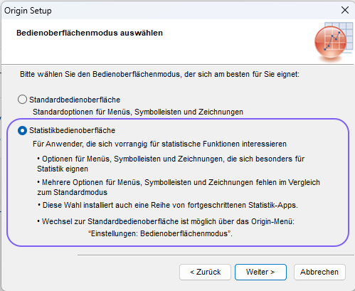 Beim nächsten Start von Origin steht Ihnen nun die Statistik-Bedienoberfläche zur Verfügung.